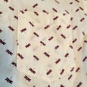 Super cute! Off white, with burgundy dragonflies. Left side chest Pocket! 100% Cotton.