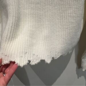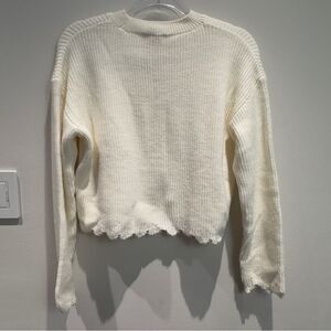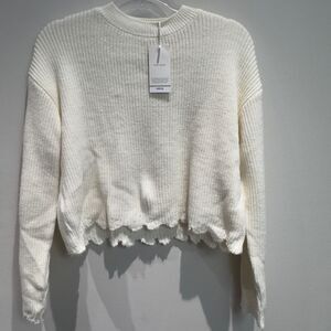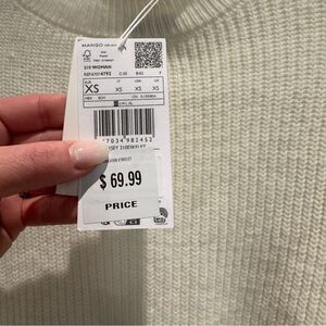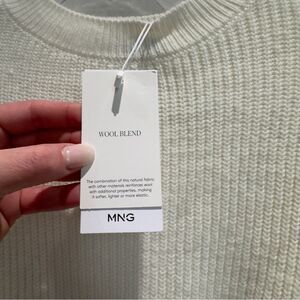 NWT- MNG Cream Sweater Featuring Distressed Edges, Crafted from a Soft Wool Blend, Available in Size XS. This stylish piece combines warmth with a trendy look, making it perfect for layering or wearing on its own. The unique distressed edges add a fashionable touch, while the cream color ensures versatility in pairing with various outfits. Ideal for both casual and semi-formal occasions.