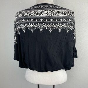 Super cute boho style crop top featuring over sized sleeve vents. It measures 22 armpit to armpit laying flat, 22 inches in length from shoulder to hem and 14 inches at the waist.