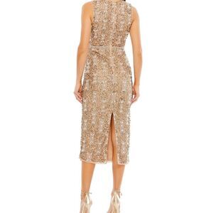 Step into elegance with this Mac Duggal dress, featuring a sleeveless sheath design adorned with shimmering sequins & pearls. The tan and copper palette, combined with a halter neckline and mandarin collar, makes it an exquisite choice for cocktail parties or as a wedding guest. Its sophisticated midi length and intricate embellishments ensure you stand out with grace and style. Hidden back zipper, double lined.