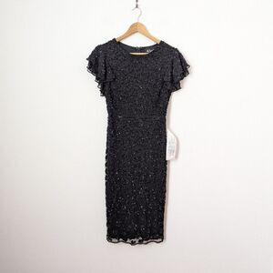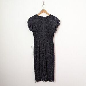 NWT Mac Duggal black sequin embellished floral flutter sleeve midi dress