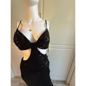 Features: Fitted silhouette with allover sequins, midriff cutouts blending into a bra-style open back, adjustable spaghetti straps, ruched sweetheart bust, and a center-back slit.