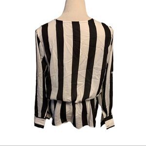 Main Street black and white striped peplum top with elastic waistband and a surplice neckline. Armpit-to-armpit 21”, sleeve 23” and length 28”. Brand new with tags still attached.