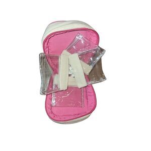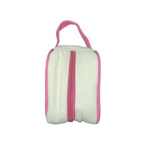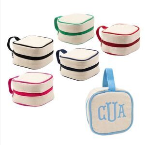 Travel while keeping all your jewelry organized with our monogrammed canvas square jewelry case. Included inside are 4 clear pouches with a touch velcro fasten closure to keep all your small pieces secure and tangle-free. Use the rest of the space to store larger items like chunky bracelets and statement earrings. Features a pop of color with its piping trim, zipper, and small handle for ease of carrying or hanging. While the body consists of a stone canvas. Perfect for adding a monogrammed initial to the top.