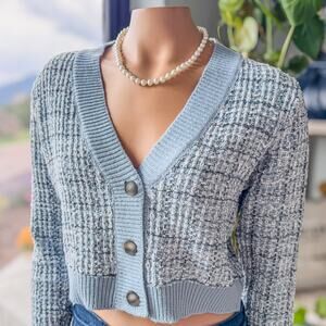 NWT-Miami of Francesca's, Lara Tweed Button Up Crop Blue Cardigan
