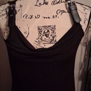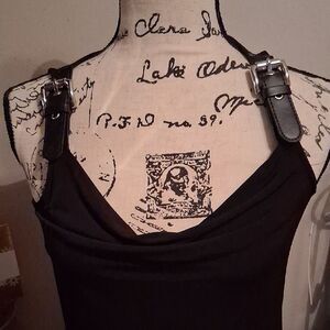 This stylish black top features unique buckle straps for a modern look. Perfect for any occasion, it offers both comfort and elegance.