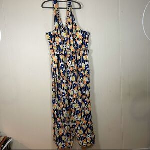 This awesome Floral jumpsuit is brand new with the extra button still attached. Therefore, I consider that new with tags. The jumpsuit has a halter neck that buttons around the neck and a cute v-neck collar. There are a couple buttons in the front and a matching belt. It has wide legs that go all the way to the bottom and smocking in the back. It’s zips on the side.