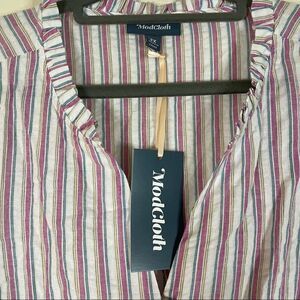 This cute top is brand new with tags attached. It has a ruffled neckline and covered buttons frown the front. It is short sleeved and lightweight. There are two sizes available. Both are new with tags, but one only has the extra button but the tag has disappeared.