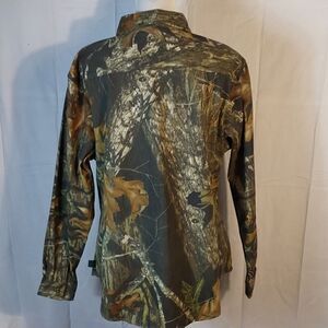 This New with tags green camo, long sleeve, button down Mossy Oak Break Up women's hunting shirt is a size 2X (16-18) with a pit to pit measuring 26". It has a left front chest covered zipper pocket. 60% cotton 40% polyester and machine washable. All offers are welcome.