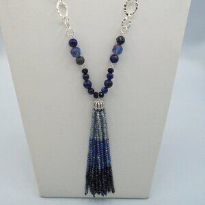 Natural Lapis Lazuli, Chrysocholla, and Czech glass beaded 34-inch necklace with 2-inch dangle earrings and beautiful fringe beaded pendant. The beads are just lovely and blend so well together. I chose some very nice silver finish hammered oval components in two sizes to add accent and space the beads out. The fringe pendant is made up of 3mm beads in three colors, light gray, medium blue, and dark blue, and all are beautifully held together by a lovely crystal-adorned crown-shaped cap. Very beautiful set.