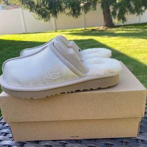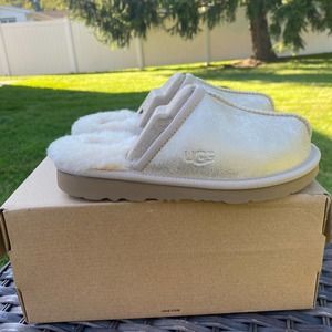 UGGplush faux fur adds cozy lining to a faux leather clog slipper that shines with a metallic finish.