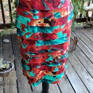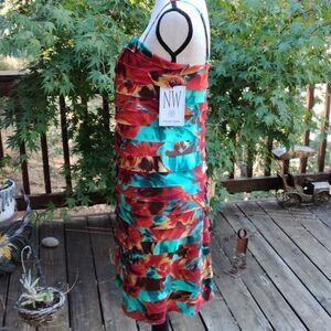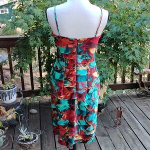 Lovely all year round, these colors will be especially beautiful on darker skin tones. Brown and teal floral in layers all around. Built in bra, adjustable straps, fully lined. Size 6 showing snugly at the top on my size 5 measures 33 at chest, 32 at waist 39 at hips, 38 long from shoulder to hem. Light and pretty for a special event.
