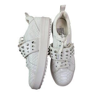 Adorable leather platform sneakers with a snake-like texture to them. Silver hardware with a studded strap that goes over the top of the shoe. Lace-up closure with logo embellished shoe laces. Great shoes to create a cool streetwear vibe.