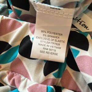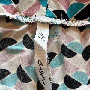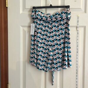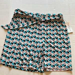 NWT-NY collections-large-multicolored patterned-elastic waist, belted shorts. lightweight, stretchy. Cream, black, pink, blue. 95% polyester, 5% spandex. See photos for approximate flat measurements..