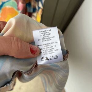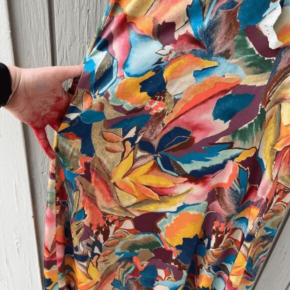 Brand‑new with tags (hangtag shows minor water staining, dress itself is flawless). This Nicole Miller New York maxi drapes in fluid satin with an eye‑catching watercolor‑floral abstract that blends sunset oranges, lagoon blues, and lush botanicals—pure dopamine dressing.