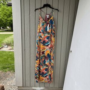 NWT Nicole Miller Satin Watercolor Abstract Print Maxi Dress, S, Pockets
