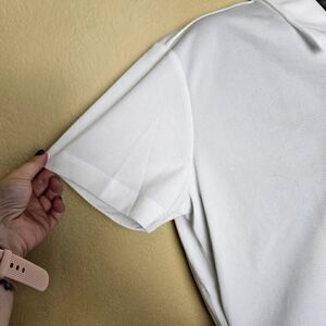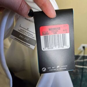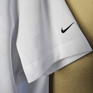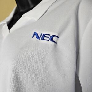 This is a new with tags short sleeved golf polo by Nike. It is white and has the North Eastern Conference, NEC, logo embroidered in blue on the chest. The Nike logo is embroidered in black on the sleeve.