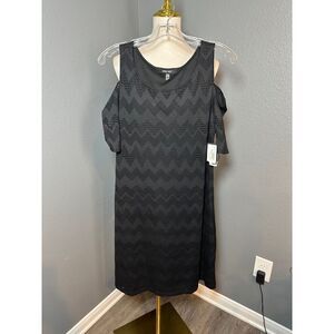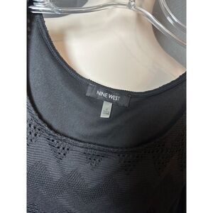 This is a new with tags and box Nine West black dress. It is a size 6 and is made in Vietnam. The dress is a midi length and has a geometric pattern. It has a scoop neck and cold shoulder style. The dress is made of a soft, stretchy fabric. It is in excellent condition with no visible imperfections.
