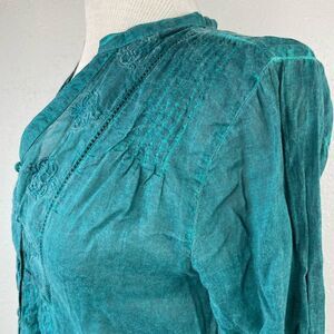 Beautiful green button down by Nine West. It measures 18 inches armpit to armpit laying flat and 26 inches in length from shoulder to hem.