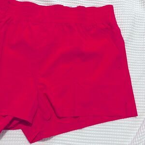 Bright pink/magenta, 4” short, unlined, back small pocket, high rise, small side slits
