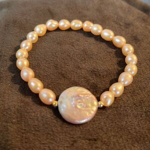 NWT PURPLE COIN KESHI PEARL & PEACH FRESHWATER STRETCH PEAL BRACELET IN SS.