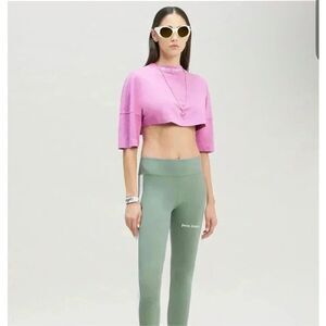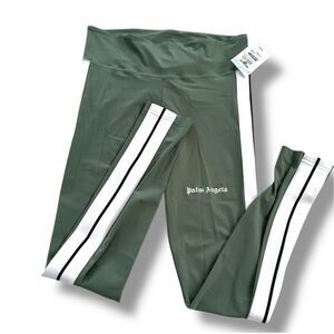Athleisure, Designer, Stripes, Comfort Fit, NWT, Streetwear. Palm Angels track leggings, NWT Palm Angels, sage green leggings, designer streetwear, athleisure, size M, side stripe leggings, high-stretch fabric, rare colorway.