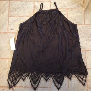 This top is new with tags. It's black with a lace overlay. The bottom lace makes a sort of handkerchief hem.