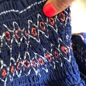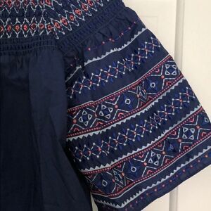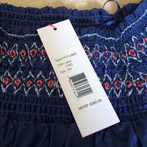 New with tags. Parker of shoulder navy top. Size XS. Beautiful embroidered detailing on front and back of arms. And front and back of top. Material is 100% cotton, but it has a crisp, satin feel to it. With a subtle sheen. Unlined. Gorgeous. (Bin A2793)