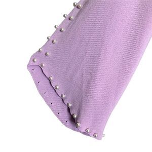 this unique top features pearls lining the 3/4 length split sleeves and cuffs.