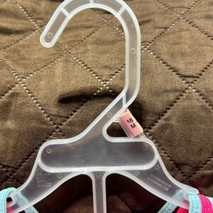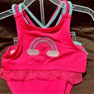 Adorable pink swimsuit with rainbow design and tutu detail. Perfect for a fun day at the pool.
