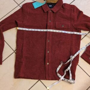 New with tag Prana IncrediWool, Italian recycled wool blend, overshirt in Rust Heather dark ref. Buttondown (snaps) shirt jacket. High quality snap closures. Large front pockets keep hands warm. Size medium slim fit please see measurements pictures to be sure of fit. Retail: $175