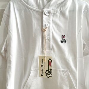The Psycho Bunny Long Sleeve Bunny Placket Hoodie is perfect for layering or wearing alone. Semi-relaxed fit hooded T-shirt crafted from lightweight pima cotton fabrication. Drawstring hoodie with a three-button placket. Iconic Bunny appliqué at left chest. Kangaroo hand pocket. Double stitched cuffs. Straight hemline. Easy pullover design. Unisex design. 100% cotton. *Brand new with tags. Authentic brand
