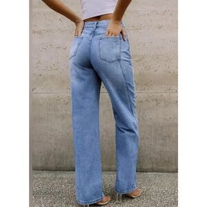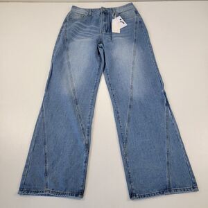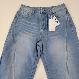 The product is a pair of NWT Commense vintage denim straight leg jeans in size large. These jeans feature a solid blue color, medium wash, and a high rise fit. They have a classic zip and button closure, with a 31-inch inseam and a waist size of 30 inches. The brand is Commense, and the style is a straight leg fit for women. These jeans are perfect for those who love the style of Revolve and Free People, with a regular fit for everyday wear.