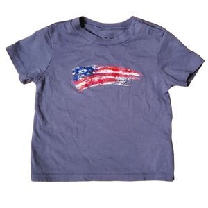 New with tags. Blue knit t-shirt with flag graphic on the front. Snaps at one shoulder for easy on and off for baby. Size 9 months.