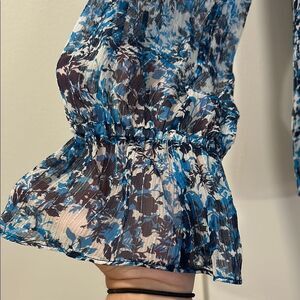 Chic blouse with a vibrant blue pattern. Features ruffled details and lined.