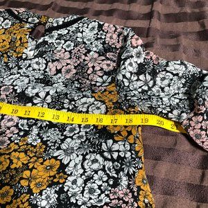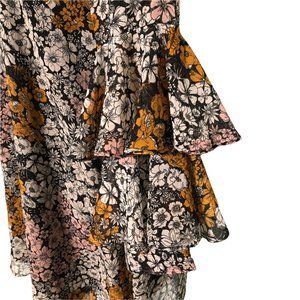 New with tags. Anthropologie Ranna Gill. Size Small. Floral Flutter Sleeve Tunic Dress with mirror detail around neck. Black w/ white, mustard orange and blush pink floral print throughout. Tiered, flutter sleeves. High neckline. Keyhole back w/ 2 buttons. Lined. 1st 2 photos are stock.