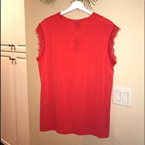 Worthington poppy red blouse. Brand new, never been worn. Sheer material on the front, stretchy spandex material on the back. Cap, lace sleeves
