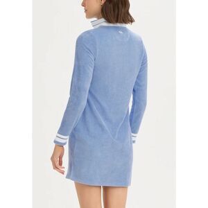 Soft, terry cloth cover up. Long sleeves with white contrast binding around neckline and cuffs. Stand up collar. 35" front length. 75% cotton 25% polyester