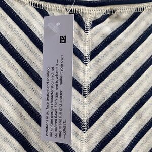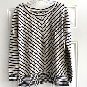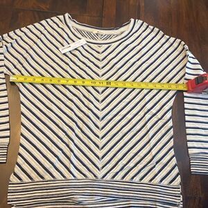 Very lightweight, dark blue, light blue striped high low hem. Pullover Long sleeve,