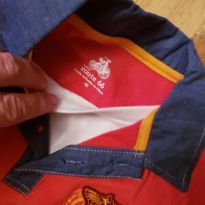 Layered look shirt, chambray collar and vintage style graphic on the back. Tje color is more orange than the photos are showing.