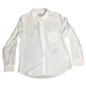 This classic design features eyelet star cutouts mixed with a luxe, elevated fabrication to create a timelessly polished look. Made from washed silk, this button-down tailored top features a single front pocket.100% Silk.Imported.FITRecommend ordering true to size.Front Body Length: 26" (Measured from Small)Chest measures-38"Model is wearing size S.CAREDry clean only.