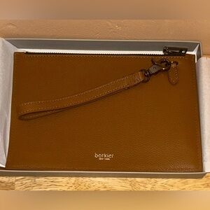 Gorgeous leather clutch with wrist strap. Designer. BOTKIER New York Pebbled finish, brand logo accent, tassel zip pulls, gift box included, detachable wristlet strap
