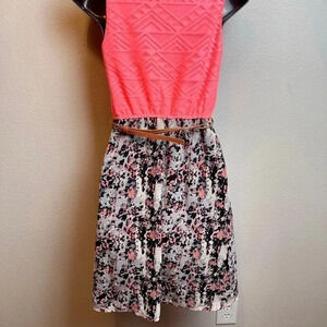 NWT’s. Vanity dress with solid coral colored crocheted/lace cutout fabric and multicolored bottom skirt. Belt included.