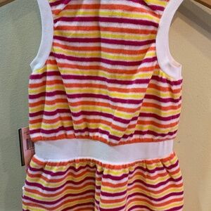 Featuring NWT's Juicy Couture Terry Cloth Dress Size 6-12months- Multi Stripe Fuchsia/ Orange/ Yellow- mini side pockets. Machine washable.
