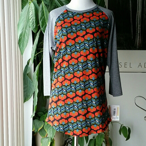 NWTS Lularoe Randy. Size Medium. Sporty baseball style top. Front and back are scooped on the bottom making it longer in the front and back. Black background with orange, teal and green floral print and 3^4 length grey sleeves. Fabric content is 96% polyester 4% spandex