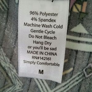 NWTS Lularoe Randy. Size Medium. Sporty baseball style shirt. 3/4 sleeves. This shirt is scooped at the bottom so the front and back are longer than the sides. Black and grey stripped background with a lavendar, mint green and pale yellow aztec pattern. Grey sleeves. Fabric content is 96% polyester 4% spandex