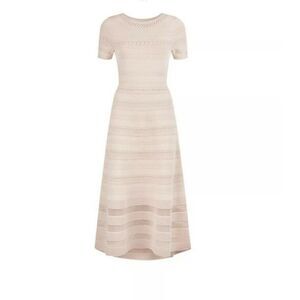 Designed for a slim fit Round neck and low scoop back, short sleeves Fitted through waist, allover banded mesh and eyelet insets Fluid A-line skirt, midi length, pullover style.