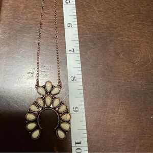 Beautiful faux turquoise and copper squash blossom necklace with that gorgeous southwestern style. Sure to dress up any western outfit. Extension change 3 inches, chain to pendant 8 inches and pendant approximately 2 inches.