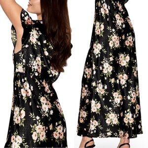 NWTSđź’“THE OCCASION Sđź’“ELITE OLD NAVY LINE LUSTROUS BLACK FLORAL SATIN FLUTTERED SLEEVE FITTED MAXI DRESS WITH DRAMATIC FRONT SLIT