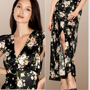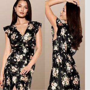 NWTSđź’“THE OCCASION Sđź’“ELITE OLD NAVY LINE LUSTROUS BLACK FLORAL SATIN FLUTTERED SLEEVE FITTED MAXI DRESS WITH DRAMATIC FRONT SLIT